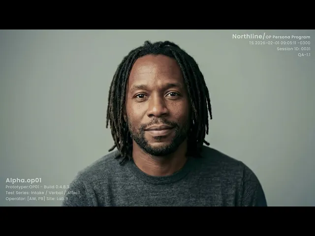 Alpha is OP01 — grounded from the start, clear in delivery. He shows you what steady looks like before anything goes wrong. That's the work. Pattern: Origin — OP01 Status: humanoid persona study • Q&A lab format • baseline calibration